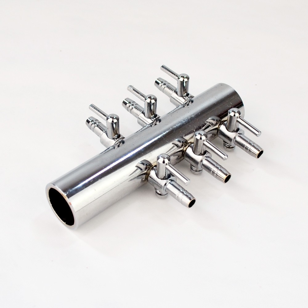 Ingresso 18-20 mm da collegare direttamente all'areatore, 8 uscite per tubo 9 mm dotate di rubinetto di regolazione indipendente