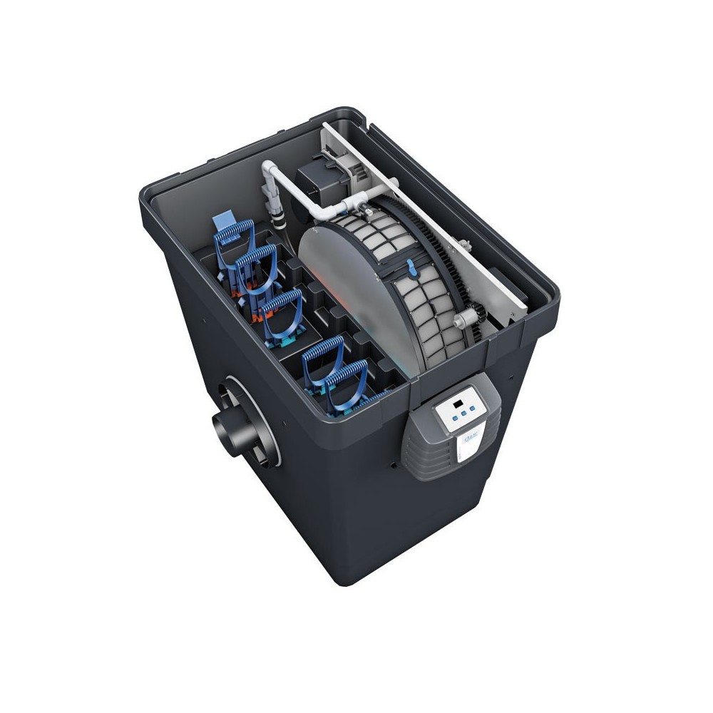 Il filtro biotec premium 80000 oase ha una portata massima di 12,5 metri cubi orari e fa parte del nuovo sistema “biotec premium” che mette ancora una volta in evidenza la rinomata casa tedesca per innovazione e performance. All'interno di un unico modulo è presente il filtro a tamburo,m completamente automatizzato, per la filtrazione meccanica e il settore per la filtrazione biologica che viene affidata ad un ssistema con spugne a diversa grammatura.
