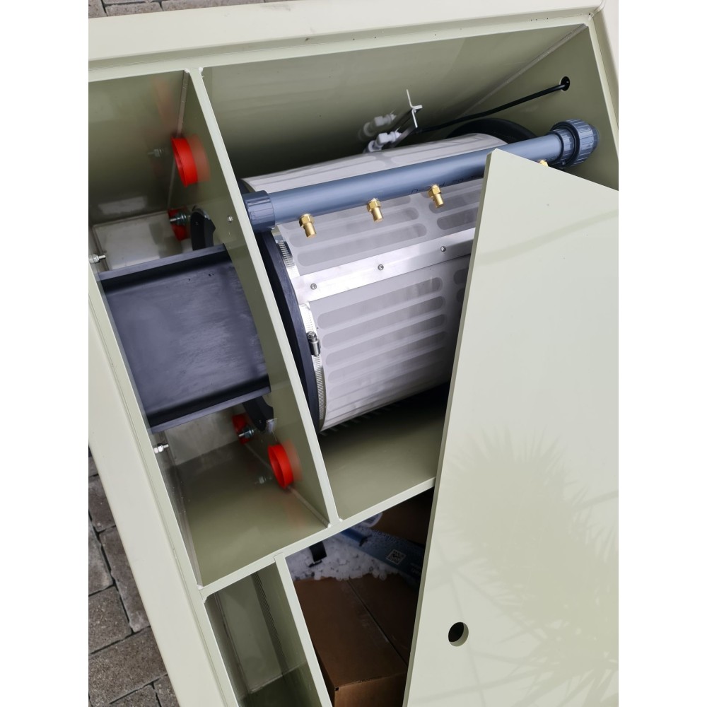 Il filtro a tamburo Combi small è un sistema di prefiltro e filtro biologico a bassa manutenzione che garantisce acqua sana e limpida con poca manutenzione, senza che l'utente debba eseguire la manutenzione quotidiana. Il sofisticato sistema è dotato di serie di una lampada UV-C ad amalgama. Il modulo UV-C integrato garantisce un'acqua cristallina. Il design sofisticato e i materiali di alta qualità producono un'elevata radiazione UV-C con una lunghezza d'onda di esattamente 253,7 nm. L'elevata dose di radiazioni uccide quasi tutti i batteri, virus, funghi e quindi fornisce acqua limpida e pulita. La radiazione UV-C assicura inoltre che il pannello del setaccio sia mantenuto pulito sia dalla crescita di biofilm che di alghe. Ciò si traduce in un funzionamento ottimale per un'acqua pulita e sana! Grazie all'elettronica intelligente, il dispositivo segnala per tempo quando la lampada UV-C non produce più radiazioni sufficienti e quindi deve essere sostituita. In questo modo avrai sempre un dispositivo perfettamente funzionante! Vantaggi del filtro a tamburo: molto compatto e facile da installare.